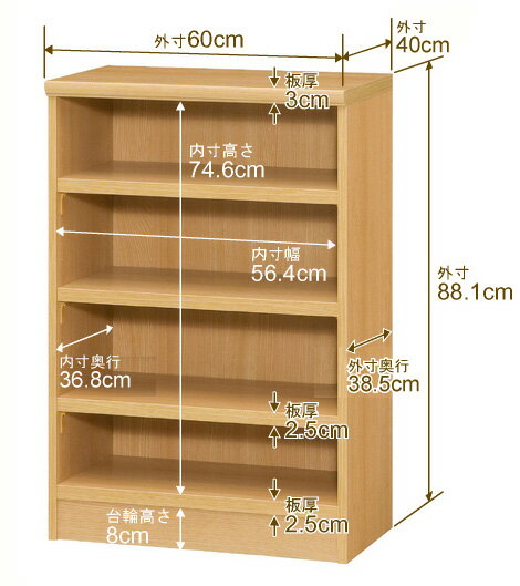 サイズ奥行40cm×高さ88.1cm×幅60cm側板(内寸)37.2cm側板(外寸)38.1cm有効内寸幅外寸幅−(マイナス)3.6cm材 質プリント紙化粧繊維板塗 装ウレタン樹脂塗装棚 板棚 板耐荷重左の耐荷重基準値表を参照)棚 板奥行36.8cm奥行40cm×高さ88.1cm×幅60cm