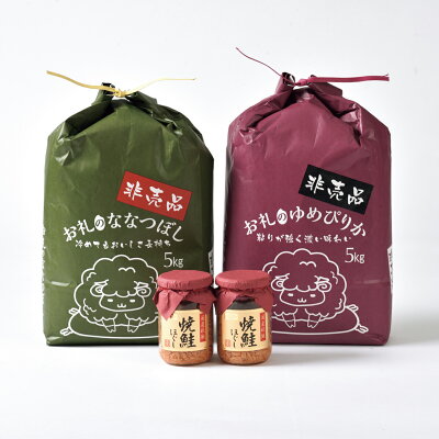 【お礼品の内容】 (1)お米:ゆめぴりか5kg 生産地:滝川市 (2)お米:ななつぼし5kg 生産地:滝川市 (3)焼鮭フレーク×2瓶 【賞味期限】 (1)と(2)お米:精米日より3ヶ月 (3)焼鮭フレーク:製造日より1年 【配送方法】 常温便 【配送時期】 令和2年10月下旬より順次発送 【注意事項】 ※一部配送出来ない地域(離島など)がございます。